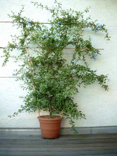 Hier mal eine als Spalier domestizierte Pflanze auf meinem Balkon, dreijährig vom Steckling gezogen. Die Blüte ist bei warmem, sonnigem Wetter ungleich üppiger.