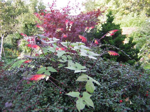 Welch tolle Farben und dann noch so spaet im Jahr. :)Ich freue mich wie ein Schneekoenig ueber die aus Samen gezogene Ipomoea lobata, wie sie da so grazil ueber den Cotoneaster klettert. Toll, haette farblich eher zum Sommer gepasst, aber nun weiss man es um so mehr zu schaetzen, da all die Crocosmias und andere Farbprotzer den Geist aufgegeben haben.