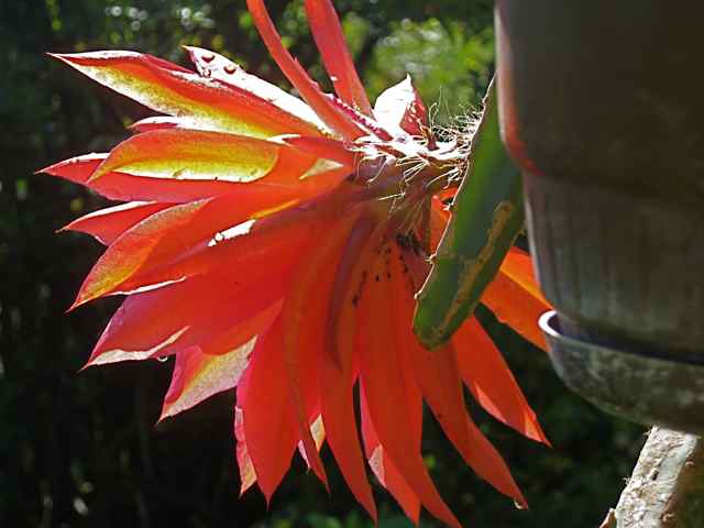 Ich habe bisher keinen Eintrag dazu gefunden. Gestern ist Heliocereus (vielleicht heißt der jetzt anders?) schrankii aufgegeangen. Ich halte ihn im Winter total trocken im ungeheizten Wintergarten, seit 4 Wochen hängt er wie jedes Jahr an der Dachrinne: