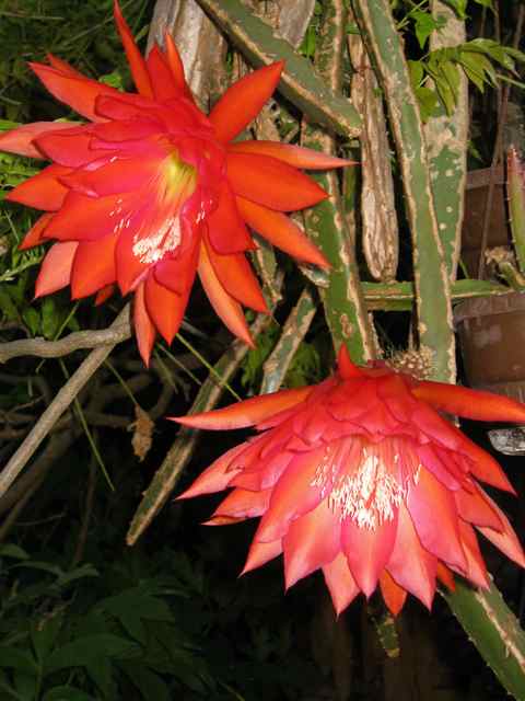 Heute abend ist noch eine zweite Blüte (Durchmesser jeweils 20 cm) aufgegangen, daher noch ein geblitztes Foto: