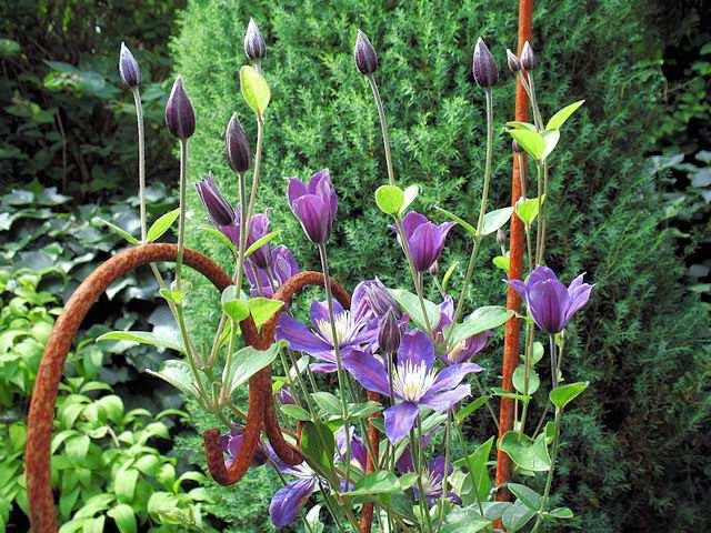 Ich habe verschiedene Staudenclematis, die nicht alleine standfest sind: Julii, durandii und zwei Arabella. Am Maschendrahtzaun lassen sie sich ganz gut ziehen (ein Bild davon steht im Kletterpflanzenforum unter Clematis), allerdings binde ich einzelne Zweige auch an, damit sie nicht abbrechen. Mit einer Arabella habe ich versucht, einen blauen "Wasserfall" auf den Terrassenbeeten zu pflanzen. Das Experiment ging total in die Hose, ohne Auflage schaben die Zweige und knicken bei Wind ab. Die Pflanze geht im Herbst auch an den Zaun.