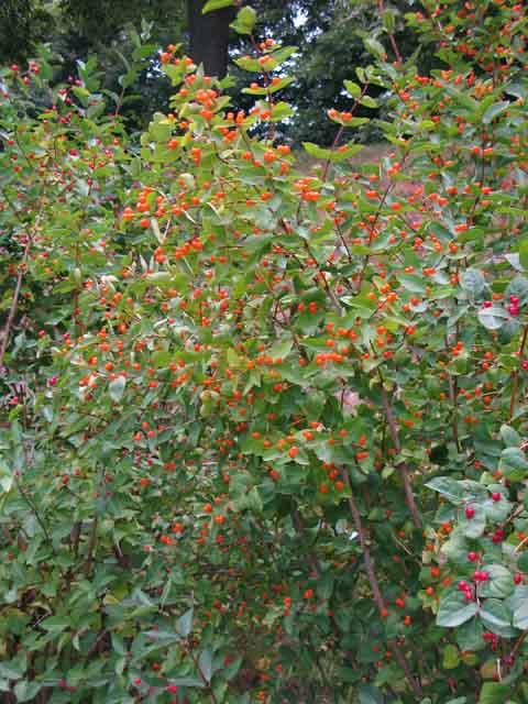 Lonicera-Frage Teil 2:Hallo zusammen,an einem öffentlichen Weg sah ich die Tage viele Rote Heckenkirschen (Lonicera xylosteum) mit ihren roten Doppelbeeren. Mitten unter diesen Sträuchern fand sich eine orangefruchtende (strauchige) Heckenkirsche. Welche könnte dies sein? Auf dem Bild sieht man zum Vergleich L. xylosteum rechts im Bild.LGRalfausBS