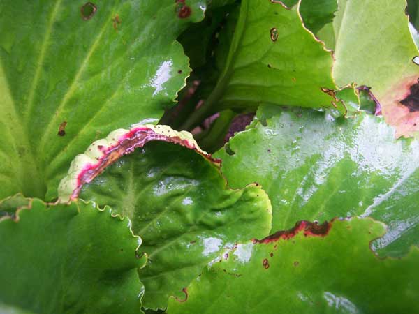 Zwischen den dicken Blättern verstecken sich nur zu gern dicke Schnecken. Vielleicht habe diese die Blattspitzen der jungen Blätter vernascht. Beim späteren Wachstum verkrüppeln die Blätter.