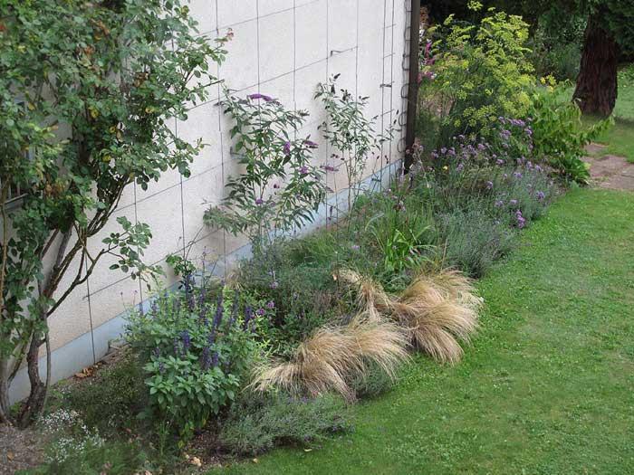 Und am sonnigen Zaun (Kindersicherung) wachsen jetzt heimische Trockenstauden (Kronwicke, Natternkopf, Färberkamille...).