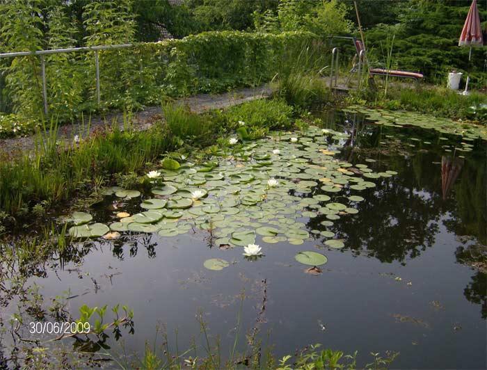 Es hat fast zwei Jahre gedauert, den Pool mit Regenwasser zu füllen (von der Dachrinne hineingeleitet). Dann haben wir ringsherum Balkonkasten-Halterungen eingedübelt, Käfige aus Kaninchendraht gebastelt, mit durchlöcherte Folie ausgelegt und mit Roh-Erde gefüllt. Da hinein kamen dann alle möglichen Arten von heimischen Teichpflanzen. Auf dem "Teichgrund" haben wir noch einige heimische Seerosen versenkt (in Kübeln). Nach einigen Jahren sah das Ergebnis so aus: