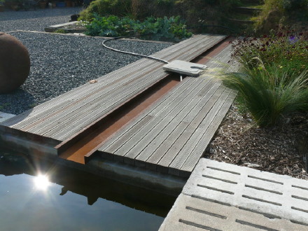 Hallo, habe heute einen am Hang gelegenen Garten besichtigt, dessen Besitzer am oberen Rand eine Wasserrinne mit allerlei Drumherum gebaut hat. Ich dachte, dass es dem einen oder anderen als Anregung dienen könnte. Der Besitzer erläuterte, dass die Betonroste um die Stahlrinne eigentlich für den Boden von Schweineställen verwendet werden. So ist es aber sympathischer ... In der Rinne ist leider noch kein Wasser, weil das Becken weiter unten noch nicht fertig ist.