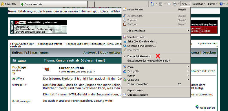 nachdem ich den IE8 installierte wurden die seiten von garten-pur nicht korrekt dargestellt.ich schaltete die webseite in die Kompatibilitätsansicht und konnte wie gewohnt verfahren.wenn die befehlsleiste ausgeblendet ist kann man sie mit der rechten maustaste (im grauen bereich des IE8) wiederherstellen.auf der schaltfläche "Seite" setzt man ein häkchen in der Kompatibilitätsansicht.