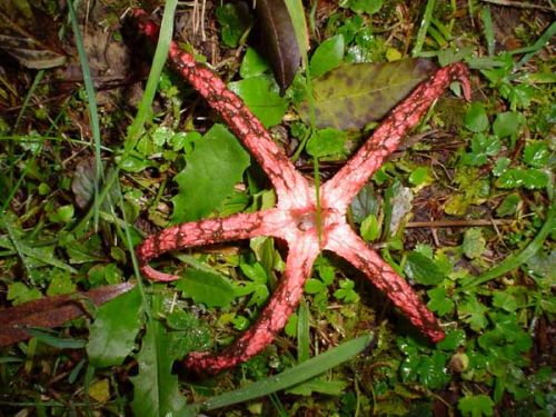 Das schöne Ekel aus AustralienDer Tintenfischpilz (Clathrus archeri) ist eine richtige Schönheit unter den Pilzen. Sein Fruchtkörper entwickelt sich aus einem im Boden eingesenkten Hexenei. Bei der Reife platzt die Oberhaut und die Tintenfisch ähnlichen, fleischroten Arme werden herausgeschoben. In diesem Zustand entwickelt der ungenießbare Pilz wie die heimische Stinkmorchel einen pestilenzartigen Geruch. Dadurch lockt er Aasfliegen an, die den schleimigen Saft mit den darin enthaltenen Sporen aufsaugen. Durch den Kot der Fliegen werden die Sporen weithin verbreitet. Aber nicht über Ozeane! Die Heimat dieses Bauchpilzes liegt nämlich in Australien oder Neuseeland.Der 1. Weltkrieg und seine Folgen:Erstmals tauchte der Tintenfischpilz in Europa während des ersten Weltkrieges in den Vogesen auf. So scheint die Annahme plausibel, dass die Verschleppung durch australische oder neuseeländische Soldaten der Alliierten erfolgte (eine zweite Hypothese vermutet die Einschleppung durch Wolle).Von den Vogesen ausgehend fand sich der Pilz in Deutschland erstmals 1934 am Rhein bei Karlsruhe und gelangte über den Schwarzwald (1938), Odenwald (1940), das Maingebiet (1953) auch nach Nürnberg (1958). Mittlerweile besiedelt er große Teile Deutschlands, insbesondere den Südwesten. Nachbarländer (Österreich, Schweiz, Tschechien) melden ebenfalls Wuchsorte. 1973 erreicht der Tintenfischpilz das spanische Baskenland.die infos stammen aushttp://www.nhg-nuernberg.de/haupt/halb/pilz_beifuss.htmlgruss renatenun 2004 in gmunden salzkammergut