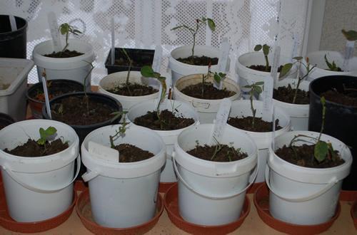 Diese sind vom Herbst 09. Vier bis fünf stecke ich in einen TopfDavon sind schon viele schwarz geworden. Die meisten, der jetzt noch stehenden haben grüne kleine Austriebe, ein paar schon Blättchen. Das heisst aber noch gar nichts. Bis zum Herbst passiert jetzt gar nichts mehr mit ihnen. Die, die dann noch leben, kommen in grössere Töpfe. Es sind viele verschieden Sorten.Im Hintergrund stehen auch noch White Gold und Orpheline de Juillet, die viel stärker gewachsen sind, als ihre anderen Geschwister.