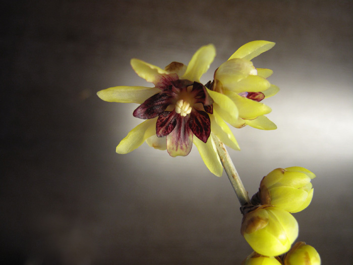 Im Garten habe ich Chimonanthus Praecox, die Winterblüte nicht fotografiert bekommen. Aber da ich sowieso einen Zweig für die Vase geschnitten habe konnte ich es dann auch besser festhalten. Der Duft ist ganz wunderbar!