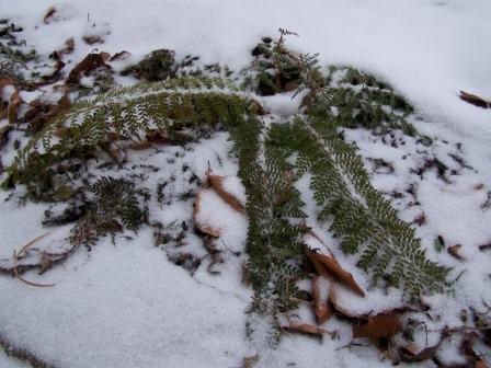 Dann habe ich noch einen Asplenium trichomanes gefunden, der noch ein wenig grün ist. Der Hirschzungenfarn ist komplett zugeschneit.