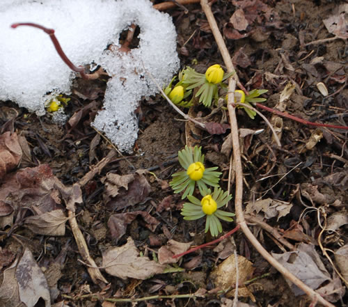 Hat noch jemand erste Frühlingsblumen in seinem Garten gesehen?Ich trau meinen Augen kaum, da sind sie, die ersten Winterlinge, lieber möchte ich sagen Frühlinge! An einer geschützten Stelle unter einem Strauch, die einzige Stelle, die wirklich schneefrei ist.