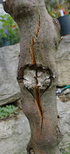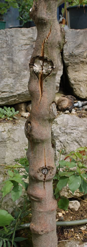 ...wenn es nur der Riss wäre, hätte die Feige wohl noch Chancen zu überleben, aber Frostschäden im Innern des Stamms (Ursache des Risses?) könnten wohl das Ende bedeuten. Nichts desto trotz, die Hoffnung stirbt zuletzt, gib der Feige noch ein paar Wochen, vielleicht treibt sie sogar von der Basis wieder aus.Er hat bis jetzt nicht ausgetrieben.Oder hat es ihn wohl ganz erwischt diesen Winter?
