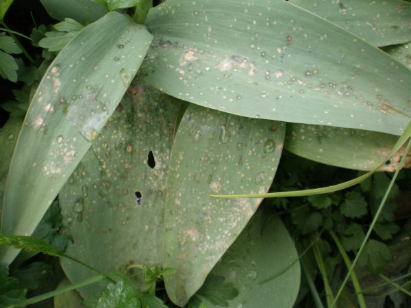 Sieht wie botrytis aus :PIch hab in solchen Fallen wenigstens bei Tulpen das Laub entfernt und in der Tonne entsorgt. Zwiebeln im Sommer aufnehmen und woanders pflanzen ist wahrscheinlich auch nicht dumm. Ich hoffe das andere Dir mehr positives sagen können.