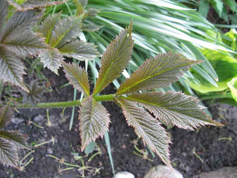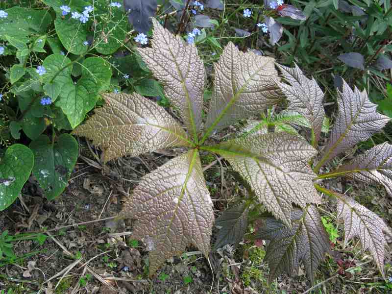 Ich habe eine Rodgersia unter dem Namen "Chocolate Wings" gekauft.Die treibt auch so schön dunkel aus und sieht ansonsten genauso aus wie R. aesculifolia.Und sie bleibt auch übers Jahr dunkler.LGMary