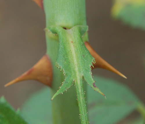 ;DWas man mit dir alles lernt.. ::)Die Stacheln sehen so aus, die sehr feinen Stacheln gibt es am Beginn eines Zweiges, nach ca. 20-30cm hören sie auf. Dann gibts nur glatte Zweige mit roten Dornen.Hier nochmal Blatt und Nebenblättchen (neu gelernt):
