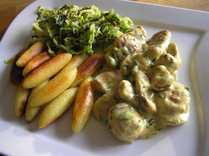 wir hatten gerade bratwurstscheibchen in senfsahne mit petersilie. dazu schupfnudeln und wirsing.