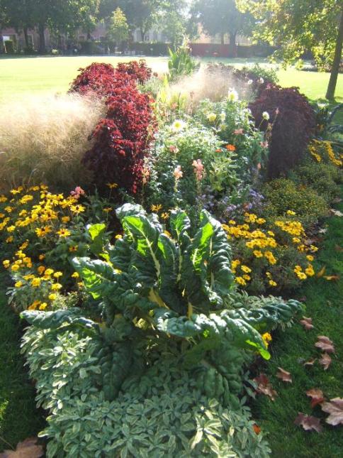 Üppige tropfen- oder augenförmige Beete, in denen neben Einjährigen auch Gräser, Kräuter (div. Salbei), Stauden (div. Heuchera) und Gemüse eine Rolle spielten, allen voran der rote Grünkohl.