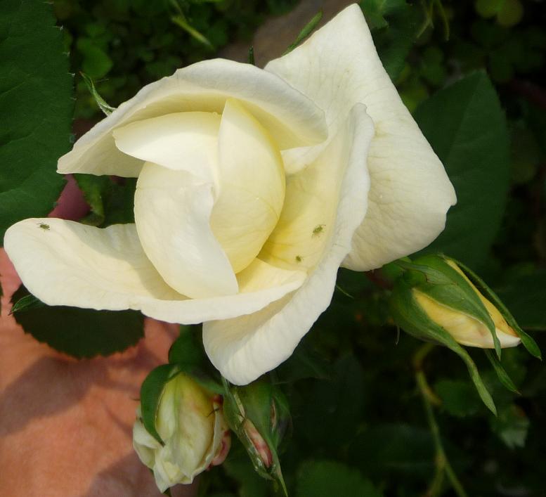 ähem, räusper, total voreingenommen natürlich als Urheberin dieser Rose möchte ich noch ganz unbescheiden meine Freiburger Perle erwähnen, die nicht wirklich grünlich ist, aber doch, obwohl auch gelblich im Knospenstadium vorkommt, eher einen kaltweißen als einen warmweißen Ton ausstrahlt, möglicherweiße wegen der leicht grünlichen Adern die sie manchmal in den Blütenblättern hat.