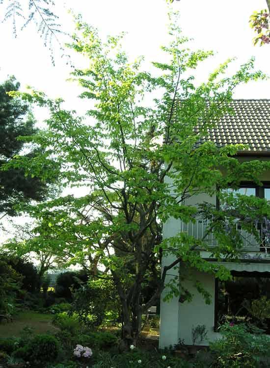 Unsere riesige über 40 Jahre alte Parrotia persica wurde vom Erbauer des Hauses direkt an eine Hausecke neben der Terrasse gepflanzt. Wer eine solche Pflanze mal in seinem Garten gehabt hat, weiß, dass es reine Notwehr ist, sie zum Baum umzuerziehen.Wir habe es erst vor ein paar Jahren getan, allerdings nicht selber, das hätten wir angesichts der monströsen Ausmaße nicht gekonnt. Ein wirklich gutes Unternehmen hat es getan und der Baumschuljunior hat sich fast einen ganzen Tag damit befasst. Mit sehr gutem Ergebnis - wie ich finde, das allerdings jetzt wieder korrigiert werden muss.Hier ein Foto vom Mai 2006, ein paar Monate nach der Aufastung.
