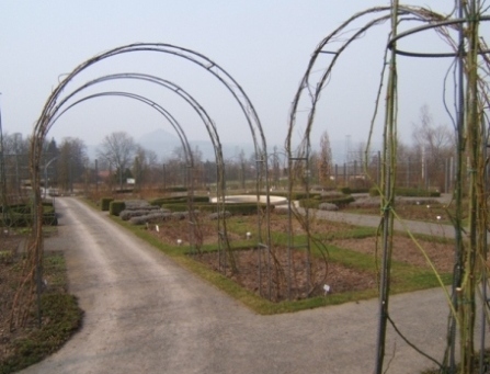 .... und selbst am früheren Haus einen Rosentunnel hatte.... ::)Wäre das keine Möglichkeit, den schmalen Schluf optisch schön zu gestalten und auch das marode Nachbarhaus links zumindest zur Hälfte nicht mehr zu sehen?So in etwa stellte ich mir die Konstruktion vor, bei Unopiu habe ich entsprechend breite Bögen gefunden. 3m gibts ja nicht mehr so oft... Sie sind aus Metall und würden damit zum nahen Geländer der Terassentreppe passen.