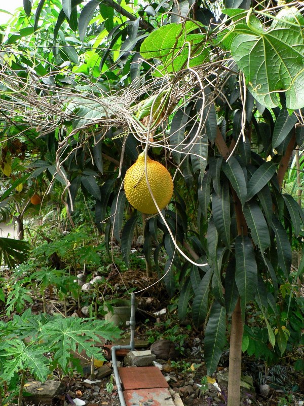 für durian halte ich die frucht eigentlich für "zu wenig und zu klein" bestachelt - die blätter passen allerdings dazu.könnte ggf. auch brotfrucht oder jackfruit sein. passt eher zu den früchten, aber nicht zu den blättern.... außerdem wachsen jackfrüchte direkt am stamm raus.