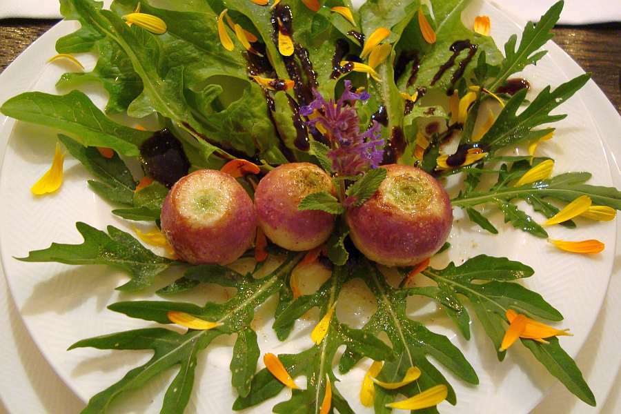 als vorspeise gab es in butter geschwenkte mairübchen mit stauden-rucola (diplotaxis tenuifolia) und lactuca sativa 'lingua di canarino'.