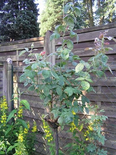 um noch einige Fotos zu machen. Habe dabei noch ein nacktes totes Küken (Amsel?) gefunden und es erstmal beerdigt. :-\Das Rosenbäumchen ist dadurch, daß die Äste steil nach oben wachsen 1,80- 2,00 hoch.Ich schneide im Herbst immer auf 4-5 Augen zurück. Ist das OK oder muß mehr weg, damit es buschiger wird.
