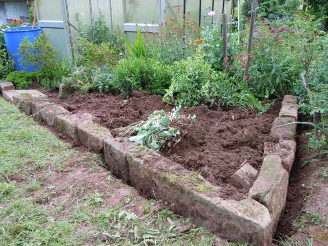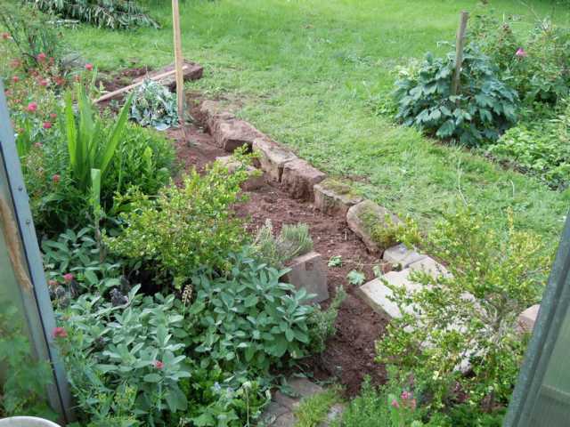 fertig :(Der Eingangsbereich meines Gewächshauses wurde schon immer sehr stiefmütterlich behandelt. Das Gewächshaus steht etwas tiefer als die umgebende Wiese, unglücklicherweise an einem Nordwesthang.Vor dem Gewächshauseingang (Süden) waren ein paar Kräuter, 2 Buchsstämmchen von einem Vorweihnachtsramschverkauf, ein Salbei und so restliches Gewuchere, vor allem Glattblattaster.Die vorher gerade Abgrenzung (entlang der Stauden) sollte nun etwas nach außen Laufen. Die Erde soll stark abgemagert werden und eine höheres Niveau wie vorher haben, so dass die Sonne hinbrennen kann.So sah es heute vormittag aus: