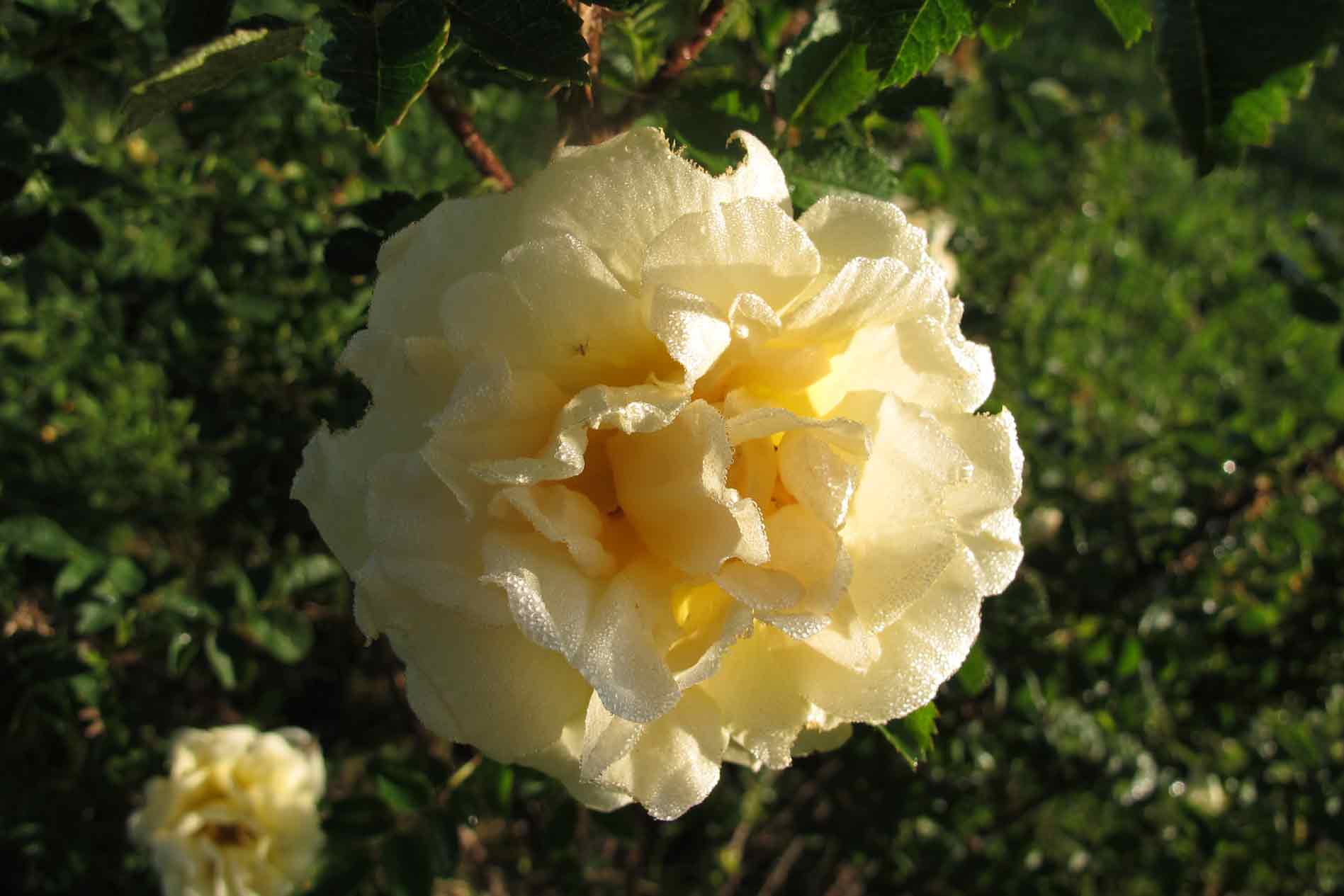 Die zweite Fundrose habe ich als Ausläufer bekommen, die Mutterrose steht an einem Haus im Dorf, ebenfalls an die 100 Jahre. Letztes Jahr hat sie mir ein paar erste Blüten gezeigt - sie hatte nicht einen Zentimeter verloren! -, heuer ist sie großzügiger und bereits auf 1,50 m. Vielleicht mag ja jemand raten, um was es sich da handeln könnte?