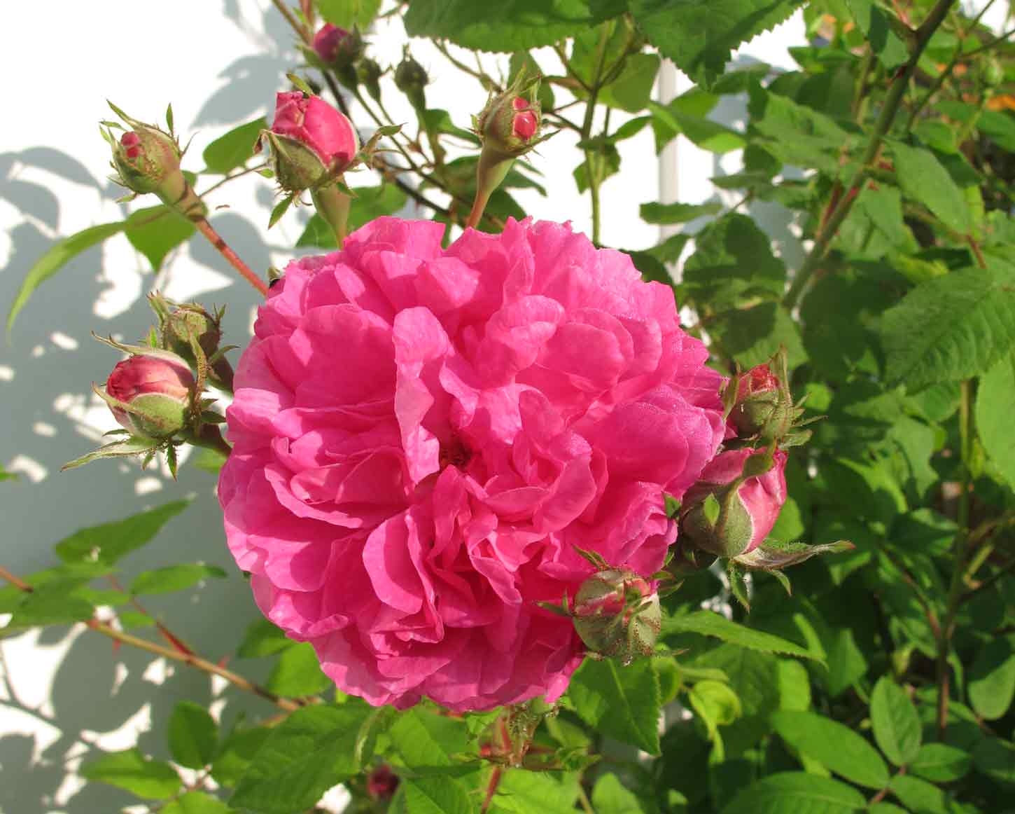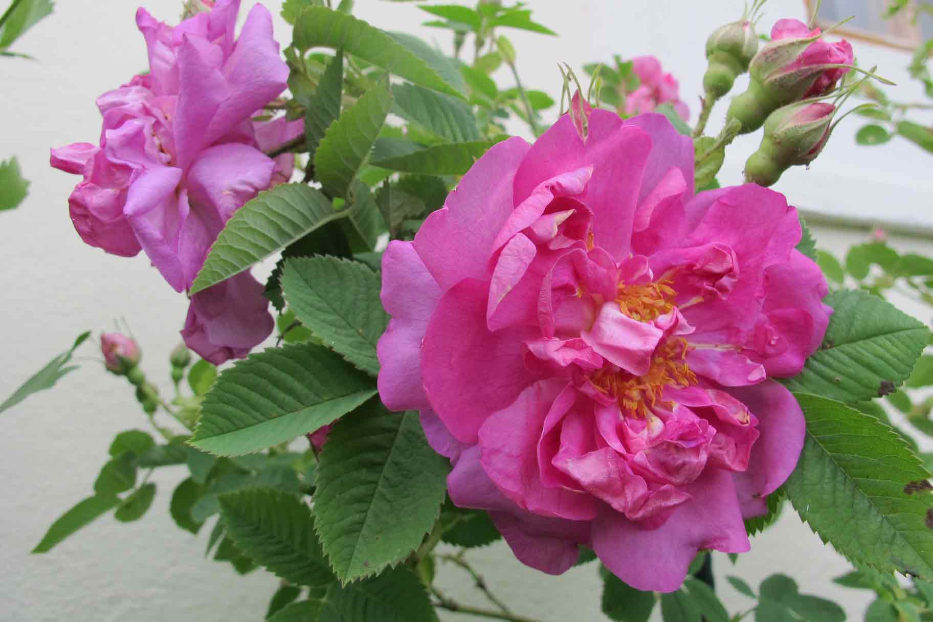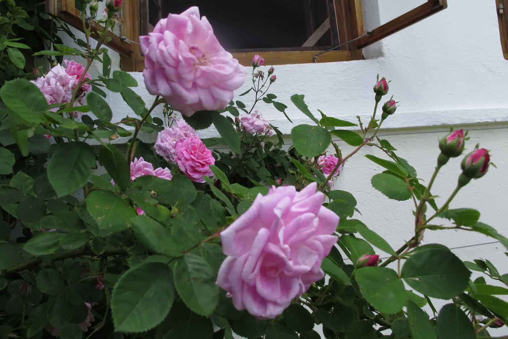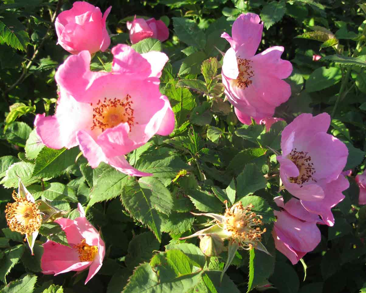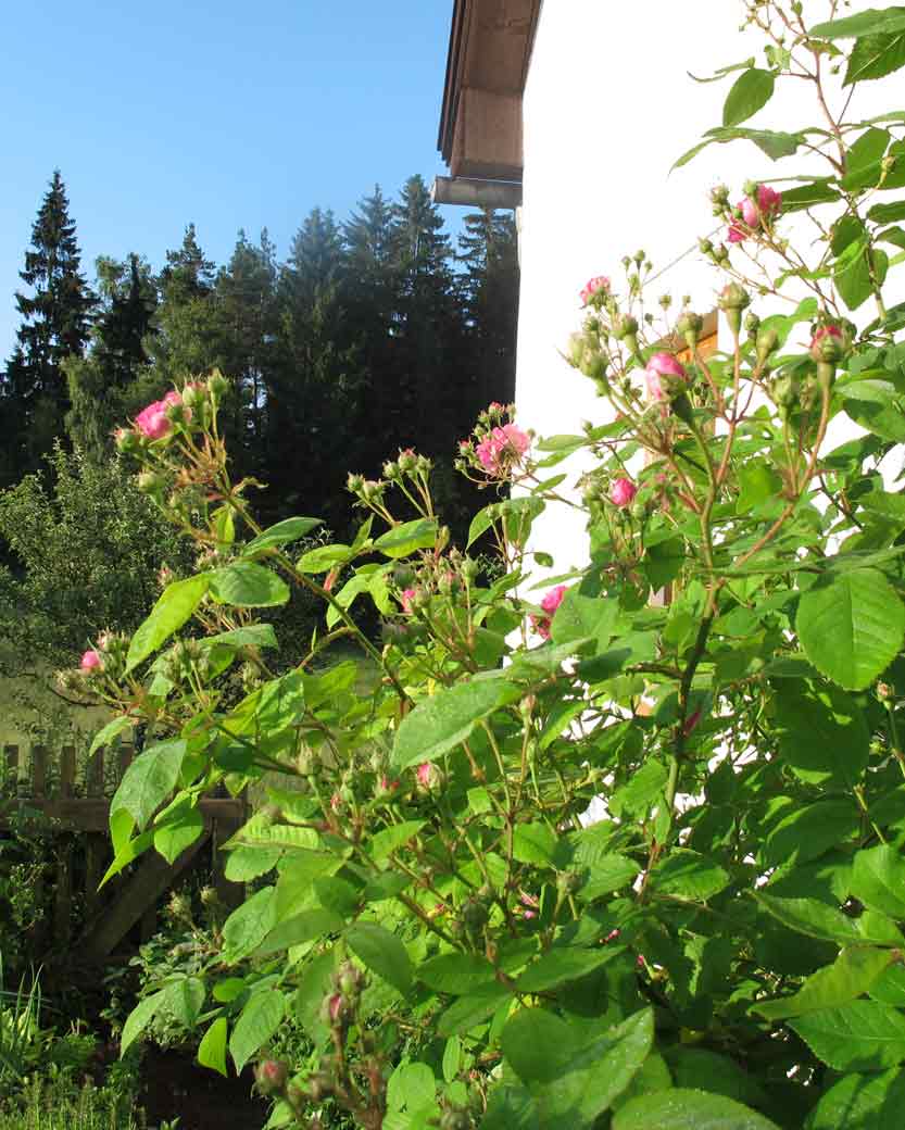 Die Nordlandrose hat meine Erwartung, die Hausecke zu füllen, noch übertroffen. Sie ist, scheint's, mit sich nicht ganz übereingekommen, ob sie ein großer Busch oder ein Rambler sein soll, was in diesem Fall von Vorteil ist - das üppige, gesunde Laub bildet einen schönen Hintergrund für die Blüten. Steht sehr geschützt südseitig, Sonne im Sommer bis ca. 13 h 30 und ist von 40 cm im Frühjahr 2010 wieder auf 3,5 m gewachsen. Ihre Blüten sind nicht lange haltbar, aber das wird durch die Überfülle kompensiert, vor allem putzt sie sich selbst. Und der Duft ist einer der besten und stärksten Rosendüfte bei mir