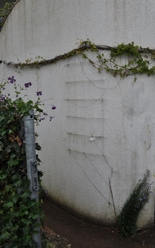 Ich habe ein Foto gemacht heute Mittag, da wars allerdings etwas dunkel.Wollémia, unten so schmal wie möglich, oben darf es schon etwas hervorhängen oder so. Die Wand ist prügelheiss im Sommer. Eine Vorrichtung gibt es schon, die war allerdings nur für die kleineren Clematis. Rechts ganz unten wachsen jetzt Glockenblumen bis in eine Höhe von 60 cm. Dort ist auch das Loch zum Bepflanzen. Leider habe ich das beim Bau viel zu klein gemacht, eine halbe Zementröhre von 30 cm Breite, wie ein U an der Wand. Der Weg ist gepflästert, da ist nichts zu machen. Rechts hat es eine etwa 1m hohe Steinmauer.Ich mach dann morgen nochmals ein anderes Foto.Oben ist nichts, ein Teil ist ein Innenhof und ein Teil eine Terrasse. Rechts kommt eine Glastüre, es hat aber oberhalb noch genug Platz um was darüber zu leiten, die Micker-Akebie kommt auch von dort.Ich wollte Rosen rüberziehen, aber die wollen auch nicht, da der Untergrund voll Bauschutt ist, wachsen sie da nicht mehr als 2 m. Campsis gelb und orange wachsen um die Ecke.(Muss jetzt gleich weg).Was ich mir schon an dieser Mauer die Zähne ausgebissen habe!Ein grösseres Klettergerüst möchte ich eigentlich nicht anbringen.