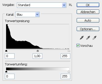 Den Grünkanal schenke ich mir; er ist auch nach links verschoben, wenn auch nicht so stark wie der Blaukanal.Dafür zeige ich hier mal, was passiert, wenn ich im Blaukanal den mittleren Regler der Tonwertspreizung nach links verschiebe ...