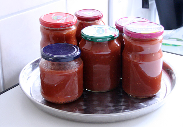 Danke, elis!! Genau das meinte ich - super. Genau so verwende ich Tomaten auch. Dann könnte man kleinere und größere Gläser abfüllen, für die unterschiedlichen Verwendungsmöglichkeiten.Also heiß einfüllen, wie Marmelade, zuschrauben, fertig?? Und das hält sich (zumindest bis man es verspeist)? Ich dachte immer, bei Marmelade macht auch der Zuckeranteil einen Teil der Konservierung aus, darum war ich mir nicht sicher, ob das einfache Heißabfüllen ohne zusätzliches Einkochen auch bei ungezuckerten Gemüsen funktioniert.Hallo stefanie !Ich mache es mir ganz einfach. Koche nur die Tomaten, samt Haut, püriere sie und fülle sie in Schraubgläser. Fertig. Wenn ich sie verwende, dann würze ich erst so wie ich es will und gerade brauchen kann. Tue diese Tomaten auch öfter nur in Soßen mischen, beim Rinderbraten oder Gulasch. Schmeckt wunderbar. Dann hat man noch alle Möglichkeiten. Das mache ich schon jahrelang so. Es geht auch ruckzuck ohne viel Aufwand. Meine heutige Ausbeute von einem großen Topf voll Tomaten.lg. elis