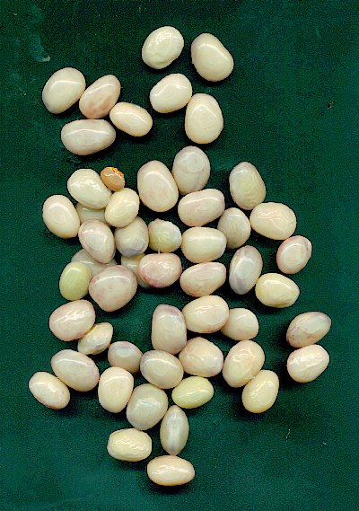 so sehen sie aus, die halbreif geernteten kerne dieser phaseolus vulgaris - sorte, nachdem sie gekocht wurden.fast wie nasse flußkiesel in feinen tönen von grau, rosa und grün.allein wegen dieser wunderbaren farben lohnt der anbau.weitere gründe eher prosaischer natur sind: hervorragender geschmack, großkernigkeit, leicht auszupulen.