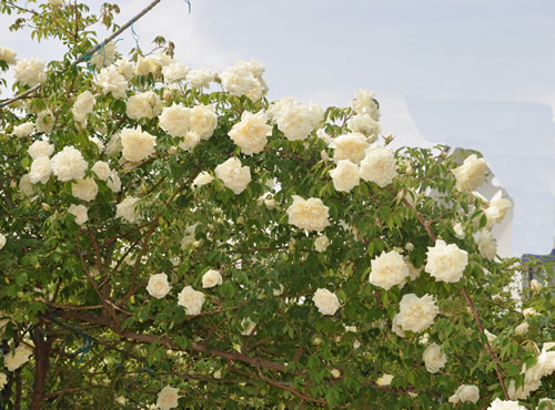 Ist sie bei dir freistehend so hoch geworden, oder hast du sie aufgebunden?Ich kenne sie nur aus der Sichtung (dieses Jahr kommt das Ergebnis) und aus einem Park. Ich erinnere mich an einen kräftigen und einen schwächeren Flor. Ein Zweig war umgefallen und hat daraufhin über die gesamte Länge Blüten gebildet, so wie man es von alten Rosen kennt. Sah bei der Blütengröße beachtenswert aus. Vielleicht ist ihr recht aufrechter Wuchs kontraproduktiv und sie sollte lieber aufgefächert werden um so den Blütenansatz zu fördern.