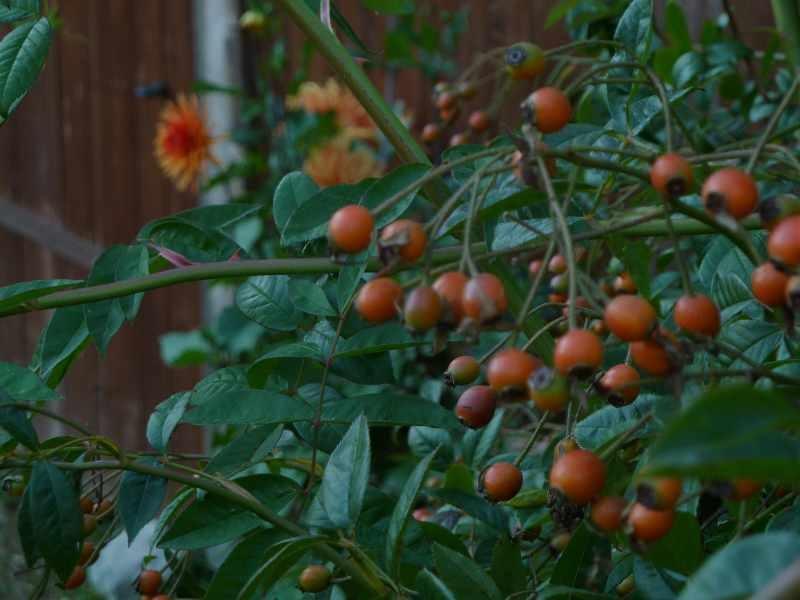 Dito, das war die einzige Dahlie, die bei mir im Topf einigermaßen was geworden ist, deshalb nochmal das Bild, wenngleich Lykkefunf hier sehr dunkel scheint, die orangen Hagebutten sieht man in natura viel besser