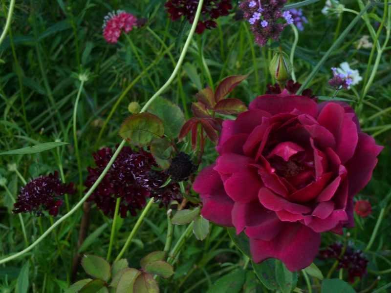 Hier blühen dzt. Astern neben den Rosen, auch Sedum, einjähriger Rittersporn, Verbena bonariensis, Sonnenhüte, Herbstanemonen, Katzenminze und Quendel. Und Gräser - Pennisetum und auch Chinaschilf.Dahlien habe ich noch nie zwischen Rosen gepflanzt, nur als blühenden Rand im Gemüsegarten. Da werden nächstes Jahr einige zu den Rosen wandern.