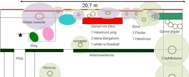 Gut soweit ist der Plan lesbar.Oben ist Süden und es schließt sich ein Weg an. rotgelb mein Maßband auf Zaunhöhe. dahinter gehört mir auch noch 1 Meter.von rechts nach links: - ganz in der rechten Ecke da denke ich mir einen Block aus Taxus hier grünes Rechteck.- dann kommt das Gewölle aus der Birke, der Haselnuss und 3 Fliedern. - das orange Rechteck ist meine Lieblingsidee: Berberis atropurpurea Hecke in 20 Jahren in Wellenform geschnitten.- dahinter sind einige sehr fadenscheinige Wildgehölze und der 1,20 hohe Fichtenstumpf mit Efeu bewachsen. Der wird irgendwann wegmodern.- dann kommt ein Flieder, ein Loch wo das ehemalige Tor war und wieder Flieder- genau vor dem Torloch brauche ich wirklich Blickdichtes. (Hellblaues Oval) Bisher fällt mir da Kirschlorbeer ein, z. Herbergii oder Mano, macht mich aber noch nicht richtig glücklich.- links kommt dann das recht kompakte alte Gewölle aus Flieder, Ribes, Zierquitte uä.- davor ist neu angelegt ein Beet: rosa eine Gruppe Spirea japonica und grün Bergenie, dazwischen kommt vielleicht Luzulla sylvatica oder so aber das ist hier nur ein Nebenschauplatz.Uff ich hoffe man sieht was ich sehe und ihr habt noch die eine oder andere gute Idee dazu.Ingeborg sich die Haare raufend