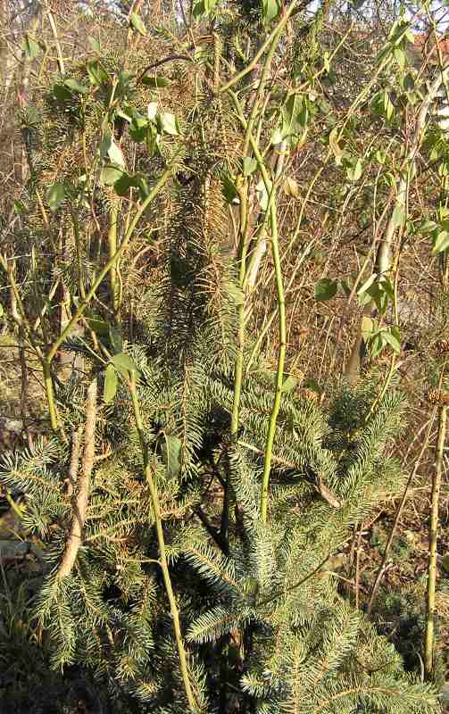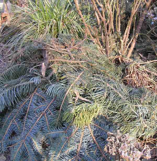 Vor einer Woche haben Nachbarn eine große Fichte umgeschnitten. Ich habe ihnen bei der Entsorgung "geholfen".Unter dem Fichtenhaufen steckt eine neu gepflanzte Novalis, die schon ziemlich dicke Knospen hat.