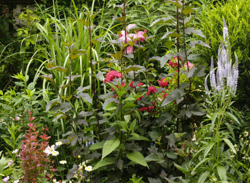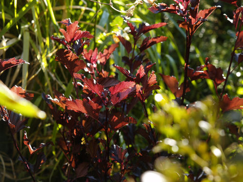 'Summer Wine' hält die saison über einen dezenten dunklen kupferton, im herbst wird sie sehr dunkel. Wächst hier in der hecke (seit ca 3 jahren, eher verhalten) und entwickelt daher nicht einen einzelstandhabitus.