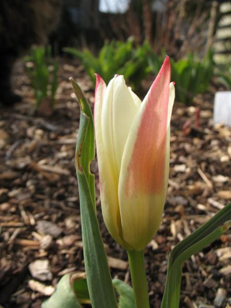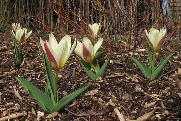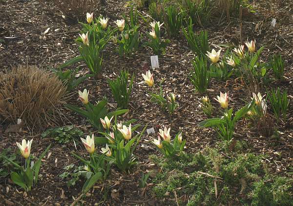 Tulipa 'The First' . Davon hab ich ca 50 locker gestreut gesteckt. Und ich erhoffe mir, dass aus jeder einzelnen ein Grüppchen wird. Bei 'Johann Strauß' ist diese Rechnung schon im zweiten Jahr aufgegangen.