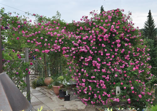 Da nun doch viele Rosen wieder blühen, kann man über die leeren Rosenbögen hinwegsehen. Exakt auf das Datum hin, haben sich die Rosen aufgeschwungen und zeigen, wozu sie hier stehen!Ein üppiger Flor lässt Rosenliebhaber schwelgen. Auch neben den Rosen gibt es genügend Anderes zu sehen. Staudenpfingstrosen, eine riesige Clematis, Mrs. Robert Brydon, die den über 5 m hohen Magnolienbaum völlig eingemummelt hat, die wird sonst 2,5 m, den blühenden Schneeflockenstrauch, viele löcherlose Hostas, Irise, u.v.m.