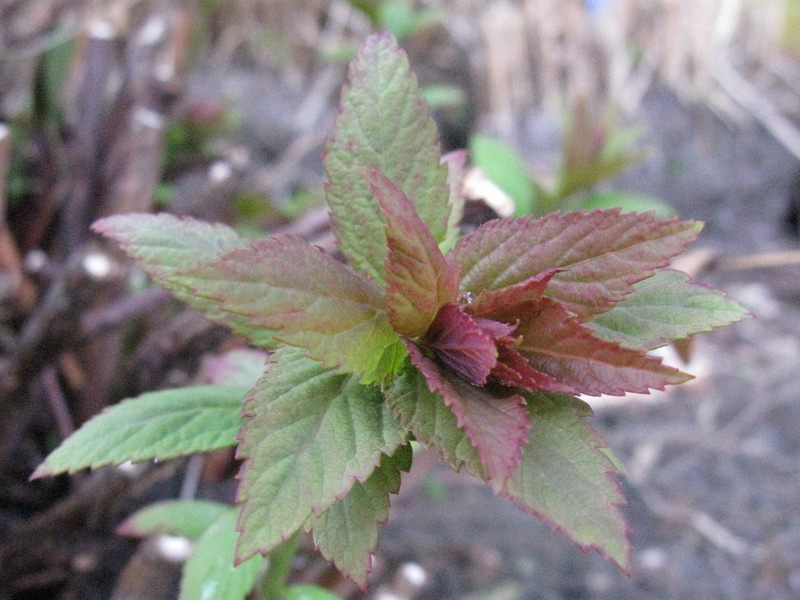 Um diese Jahreszeit liebe ich die "Golden Flame" mit ihrem gelb-bronzefarbenen Austrieb. Sobald sie blüht, verursacht sie leider schmerzende Augen - verwaschenes rosa mit bronzegelb ist ein Horror.