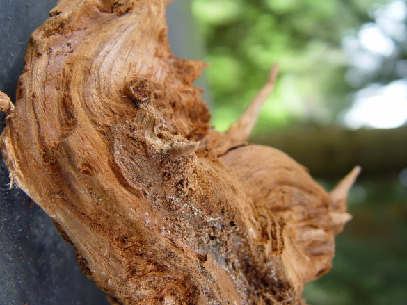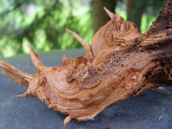 Ich besuche gern morsche Baumstümpfe zwecks Mulmbeschaffung. Die Rinden bleiben viel länger formstabil als das herrlich mulmige Innere. Ganz inwändig in den Stümpfen gibt es so einen harten Kern. Wie bei Mohrrüben, nur viel schöner. Heute konnte ich so einen Kern wieder herausdrehen und fand ihn so schön, dass er mit musste.
