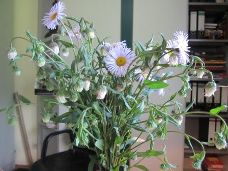 Ja, sie sind so, als würden sie schlafen, die Erigeron 'Quakeress'.Andere Erigeron, die hier wachsen sind wesentlich stabiler, kräftiger, vitaler ('Rotes Meer', Dunkelste Aller, ...), aber die "Quakeress' sehen schon im Beet aus als wären die Mäuse drunter und eine halbe Stunde nach dem Schnitt in der Vase auch so, als stünden sie schon 8 Tage in der Vase. Dabei kommen die beim Schnitt schon ins Wasser, und trotzdem sehen die so müde aus.Ich hab hier mal zwei Bilder, eines vom Beet und eines in der Vase.Hat einer eine Idee, was da los ist?Ich schicke das mal los und versuche jetzt, die Bilder kleiner zu kriegen.