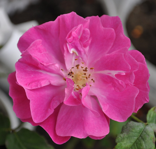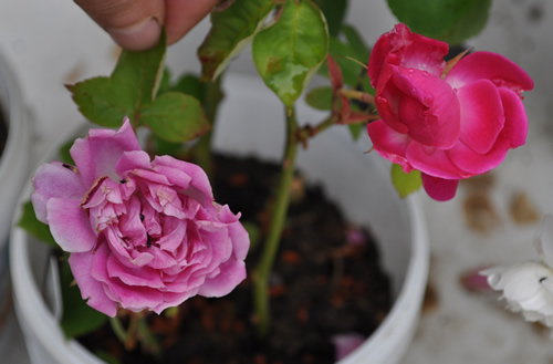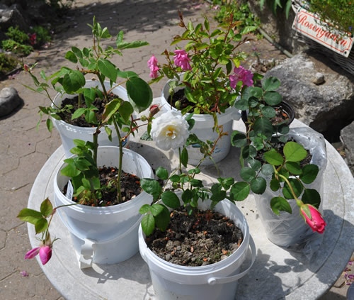 Jugendliche Rosen in ihrer Entwicklung, ein spannendes Beobachtungsfeld!Gelingt es, sie ins erwachsenen Stadium zu bringen, haben wir alle gewonnen, wir und die Rosen. Immer wieder ein Wunder was daraus wird): Belinda im zarten Alter von 3/4 Jahr, zeigt auf 12 cm "Höhe" ihre erste Blüte, (sie kam letztes Jahr aus USA zu mir, als einfaches Hölzchen):