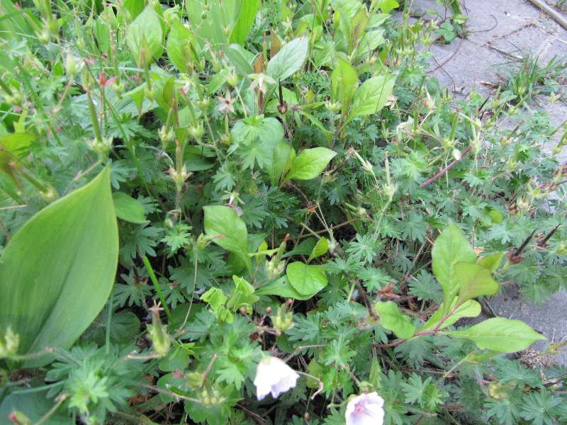 Das ist das etwas schattigere Gegenstück. Geranium sanguineum ist verblüht und so langsam kommt Ceratostigma plumbagoides durch. Die Maiglöckchen steche ich immer wieder raus. Mit diesem Arrangement bin ich recht zufrieden.