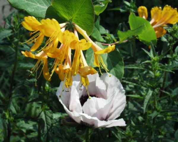 Hier nochmal eine Variante. Mohn, Lonicera und dazu Waldglockenblume. Die Glockenblume blüht etwas später.