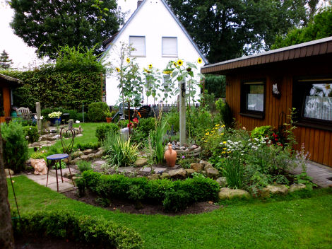 Ich versuch's mal mit einem neuen Foto.Den ganzen Garten abzulichten ist schwierig.Also das Beet sollte ursprünglich ein Kräuterbeet werden.Jetzt habe ich es aber mehr mit Stauden bepflanzt sowie Lavendel , Rosmarin, Salbei,Primeln,Katzenminze....Die Wildrosenhecke im Hintergrund werde ich noch im Herbst woandershin verpflanzen ,so das da auch noch mehr Platz für Stauden oder ein Gehölz wären.Mittig sind einige Betonringe aufeinandergestapelt und eine Säule plaziert(aufgefüllt mit Seinen).Sieht fast ein bischen wie ein Brunnen aus.Mir feht die Miteinbeziehung vom Schuppen.Es stehen zwar zwei Ilexe davor, aber irgendwie wirkt das nicht,zumal noch ein Gehweg dazwischen liegt.